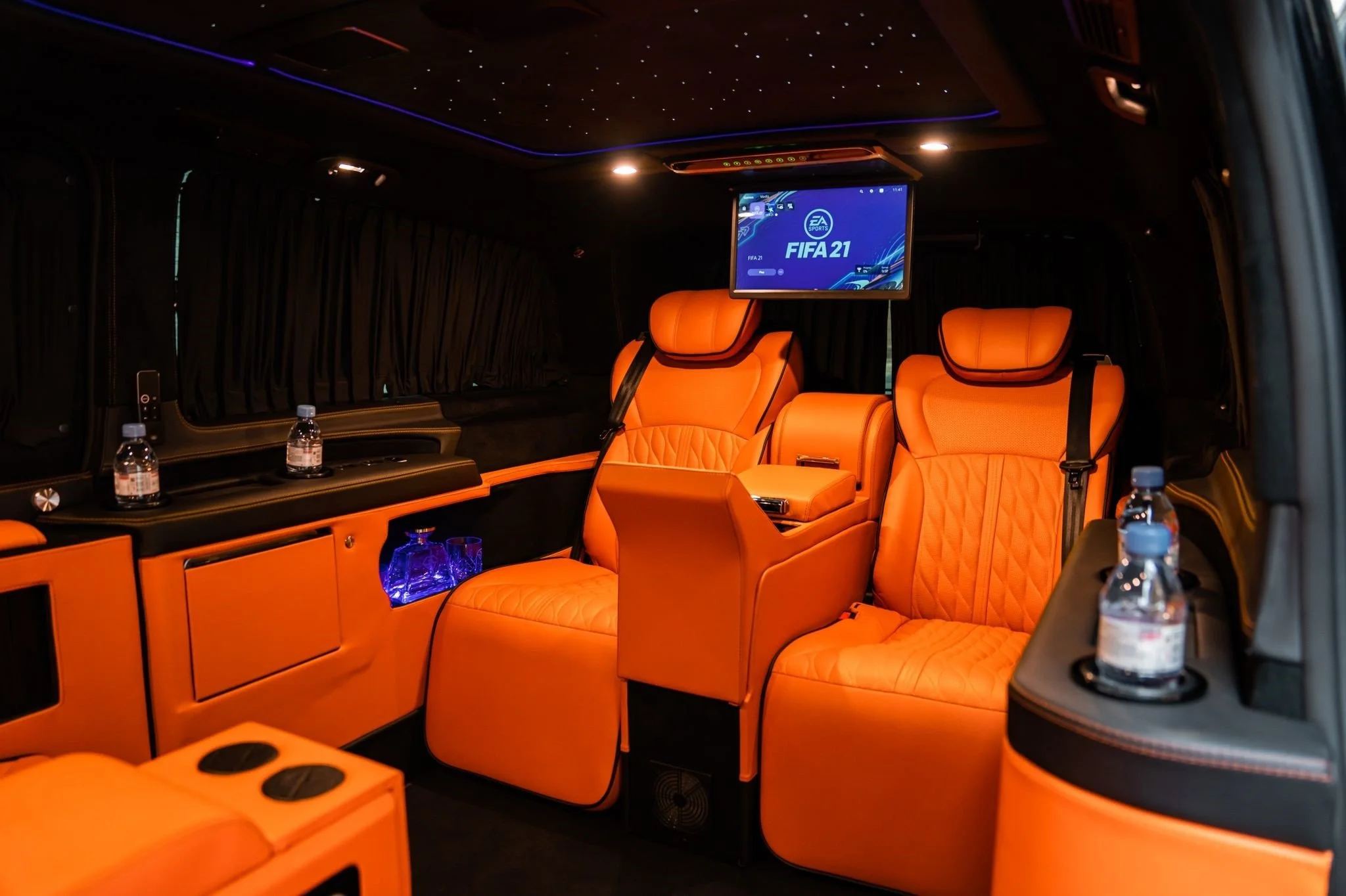 A luxurious private jet interior, wrapped in discrete V-Class packaging.